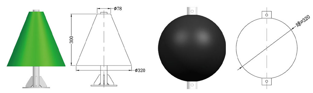 The Seagull-B rotationally molded top mark includes red can shape, green cone shape, yellow fork shape, black sphere shape, and black cone shape, all conforming to IALA standards. The main body of the top mark is made of linear low-density polyethylene material, while the support rod is made of high-strength 6061 aerospace aluminum, molded as a single piece, providing excellent visual effects, high UV resistance, strong impact resistance, and good wind conductivity.