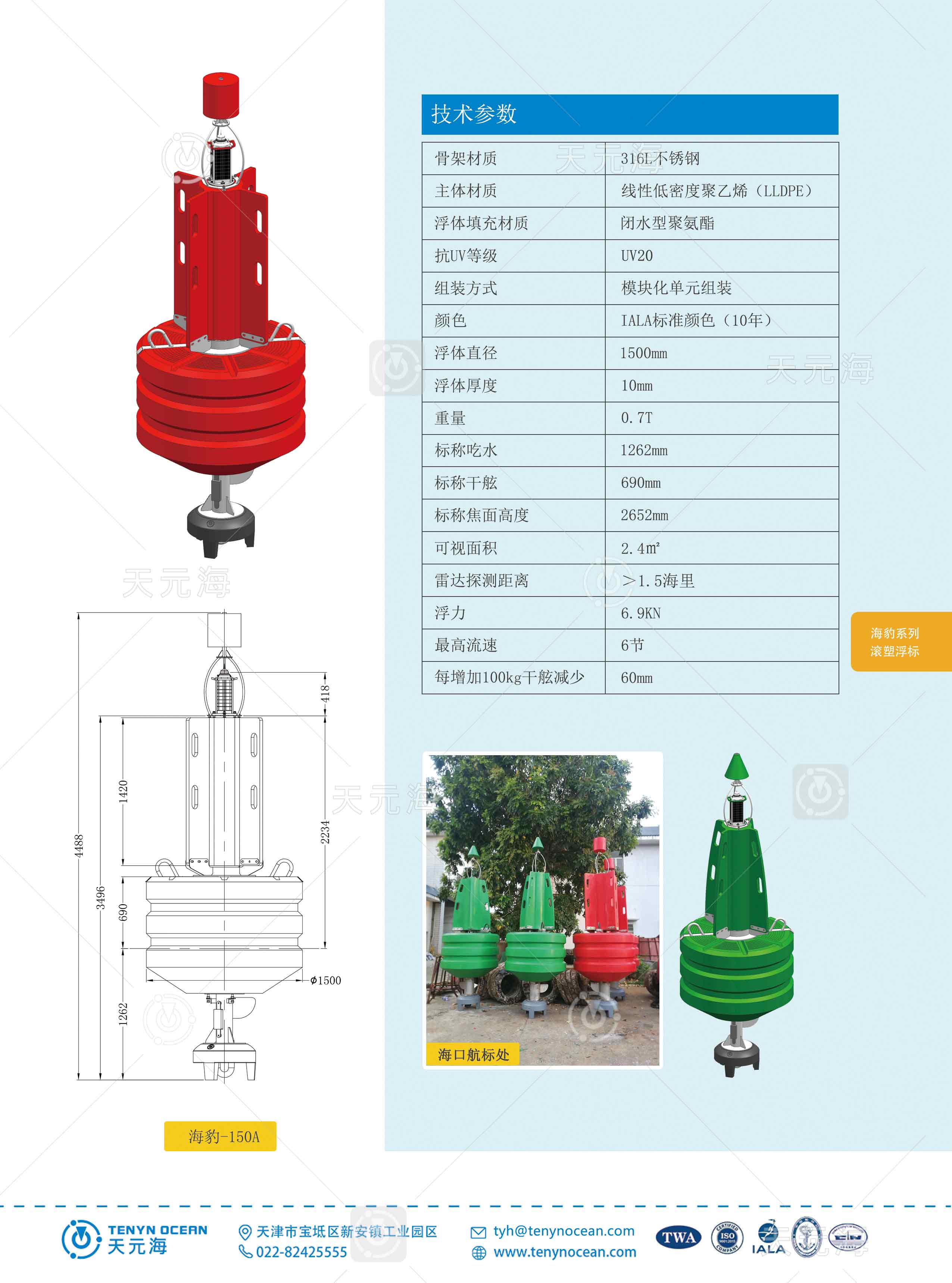 · 海豹150A型滚塑浮标主要由316L不锈钢骨架与滚塑主体模块组成,可用作内河、港口浅水区域导助航浮标或观赏浮标,也可用作应急浮标。